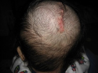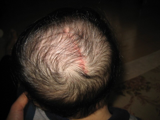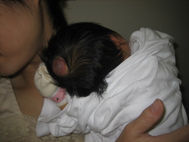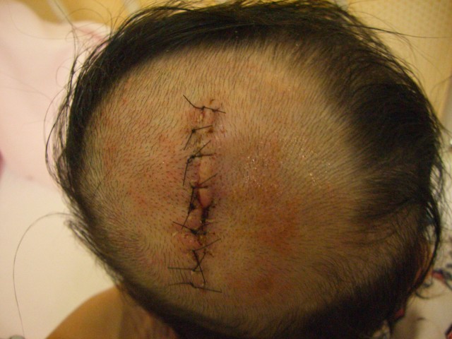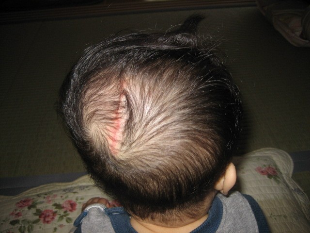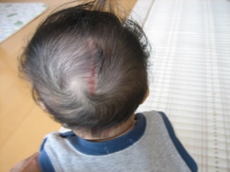 生まれた時 頭に大きなコブ(脳溜)があって、 すぐに順天堂大病院に救急車で運ばれました。 気が弱くて 頭の脳溜の写真を写す事が あまり出来ませんでした。 それでも「光汰朗の記録」に載せようと 少しづつ写しました。 手術前に脳溜のまわりの毛を剃られてしまったけど、今(2007.5.5)では すっかり生えてきて 傷口も あまり目立たなくなりました。 赤ちゃんの時、脳溜をつぶさない様に寝かせるようにと先生に言われた ので頭の下の方に 丸くしたタオルを置き、脳溜が布団に触れないように いつも気を使っていました。 そのせいか分からないけど、光汰朗の頭は絶壁に。。。 でも、最近、少し直ってきているかも。。。 |